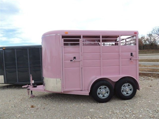 Remolque cerrado para transporte de ganado (caballos, vacas, etc.) con carrocería de acero pintado en rosa. Equipado con puerta lateral abatible, rejillas de ventilación superiores, protección inferior en aluminio diamantado y doble eje con frenos. Enganche en V con cadena de seguridad y rueda jockey. Estructura robusta para uso intensivo.